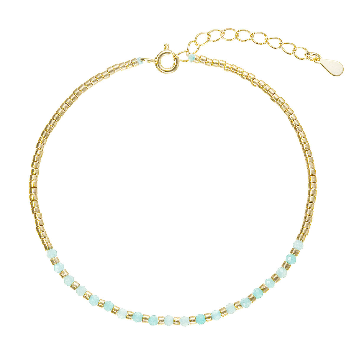 Tento jemný náramek je vyroben z pozlaceného stříbra a zdoben pravými amazonity. Skládá se z drobných zlatavých korálků, které tvoří většinu náramku, a ze sekce světle modrozelených korálků z amazonitu, jež mu dodávají svěží a elegantní vzhled.