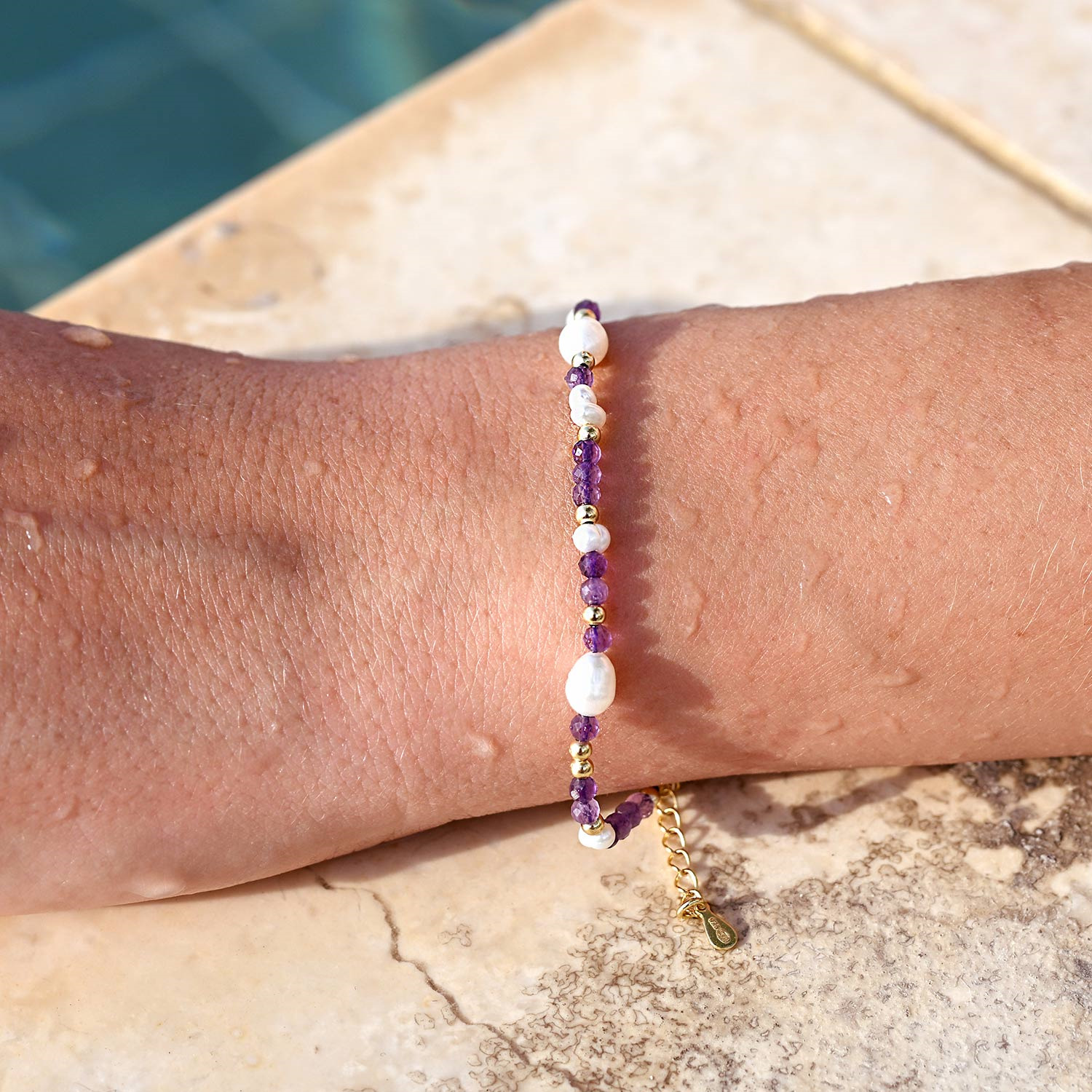 Tento elegantní náramek je tvořen kombinací pravých ametystů v jemně fialové barvě a pravých říčních perel různých tvarů, které dohromady vytvářejí harmonický a ženský celek. Drobné broušené ametysty se krásně lesknou a dokonale ladí s přirozeným perleťovým třpytem perel.