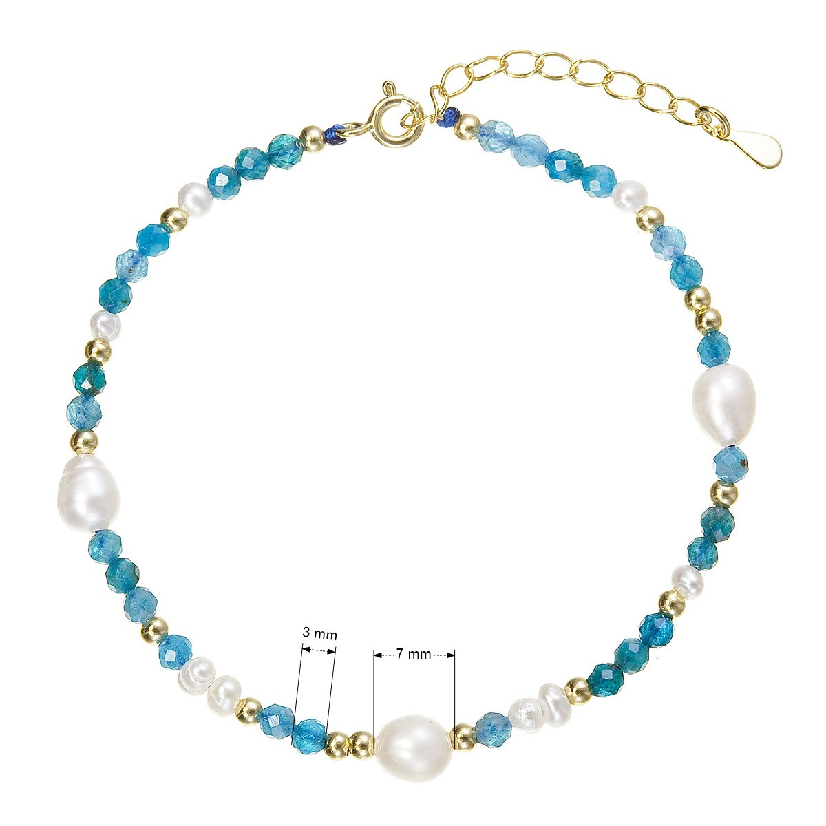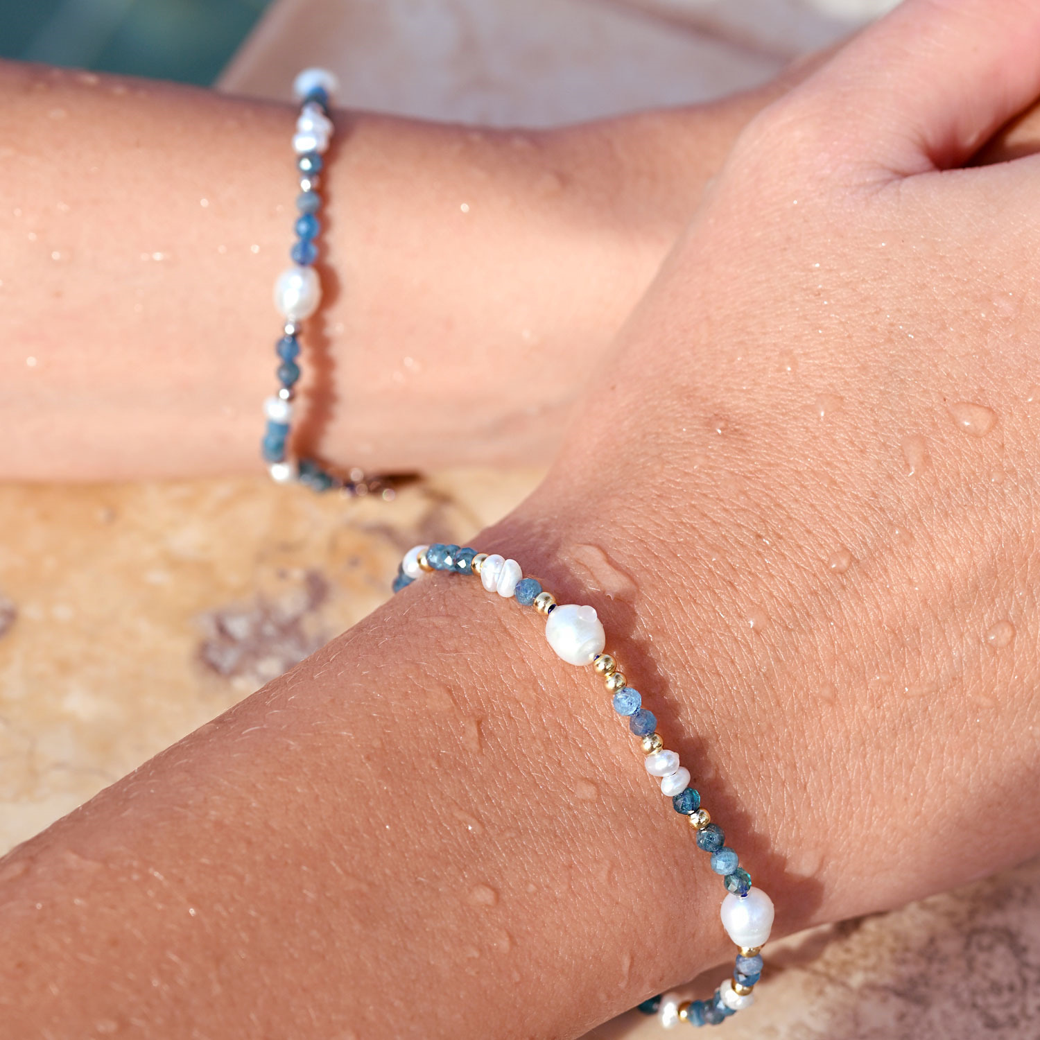 Tento jemný a elegantní náramek je tvořen kombinací pravých říčních perel různých tvarů a drobných korálků apatitu v krásné modré barvě. Lesklé perly s přirozeným perleťovým odleskem působí luxusně, zatímco apatity dodávají šperku svěžest a lehce mořský nádech.