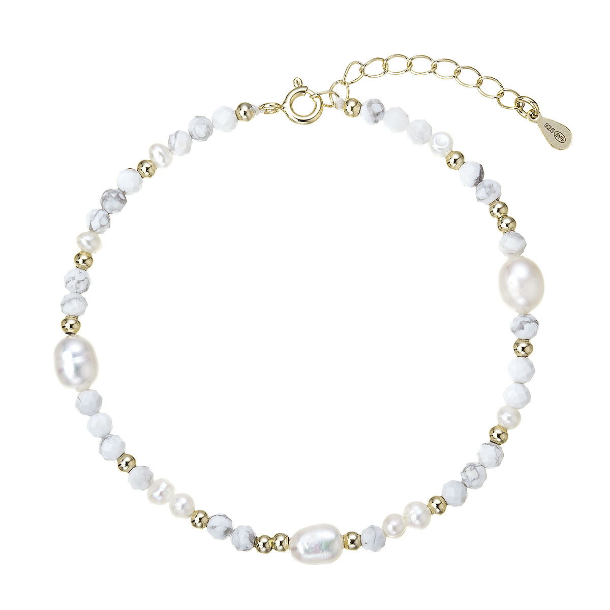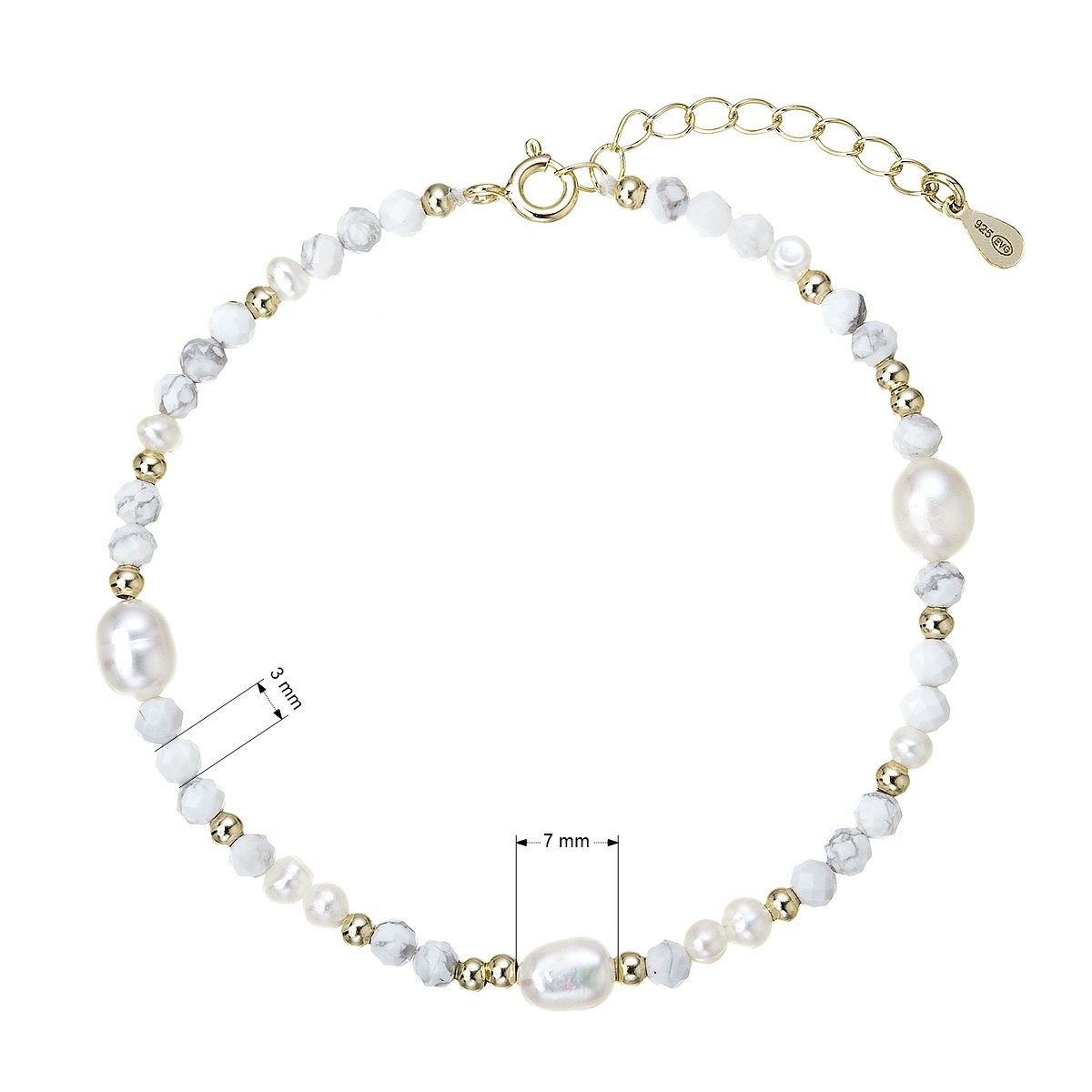 Tento elegantní náramek je tvořen kombinací pravých howlitů bílé barvy a pravých říčních perel různých tvarů, které dohromady vytvářejí harmonický a ženský celek. Drobné broušené howlity se krásně lesknou a dokonale ladí s přirozeným perleťovým třpytem perel.