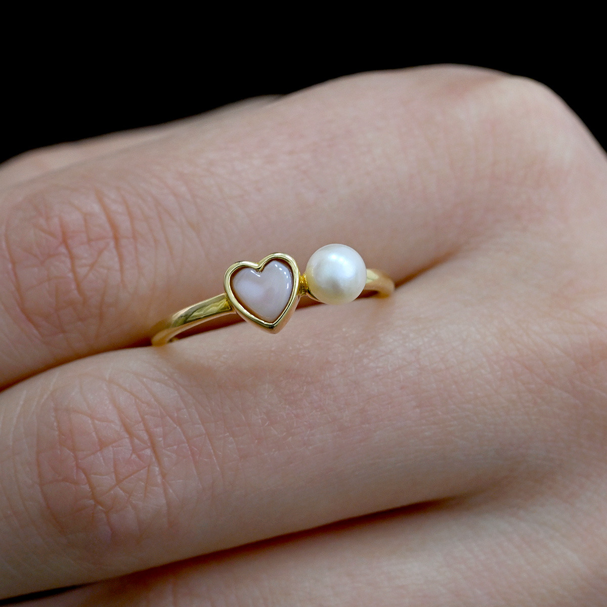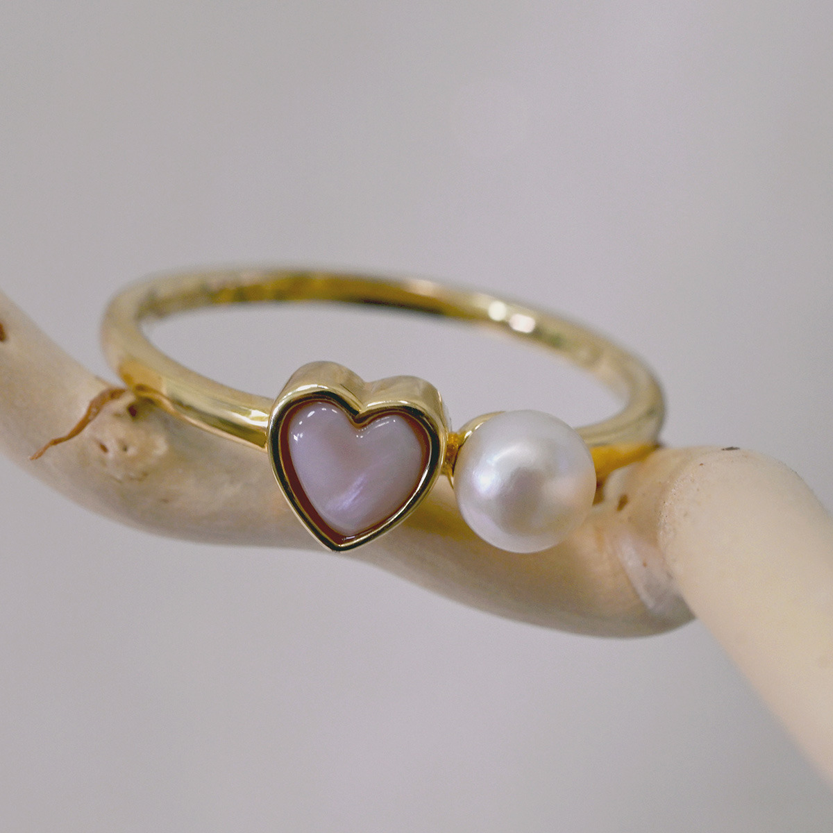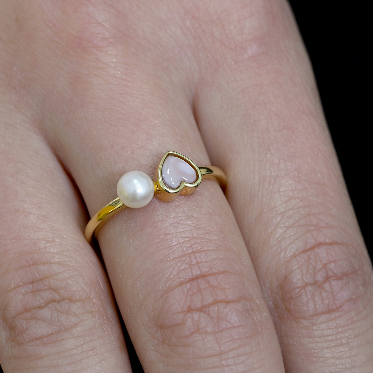 Prsten kombinuje pravou říční perlu a perleťové srdce, což vytváří jedinečný a elegantní vzhled.