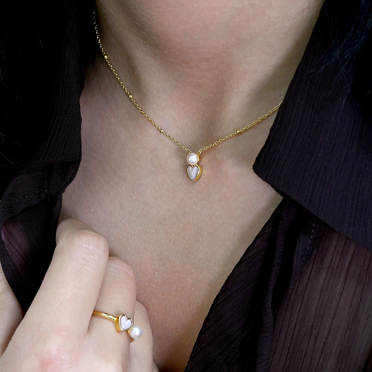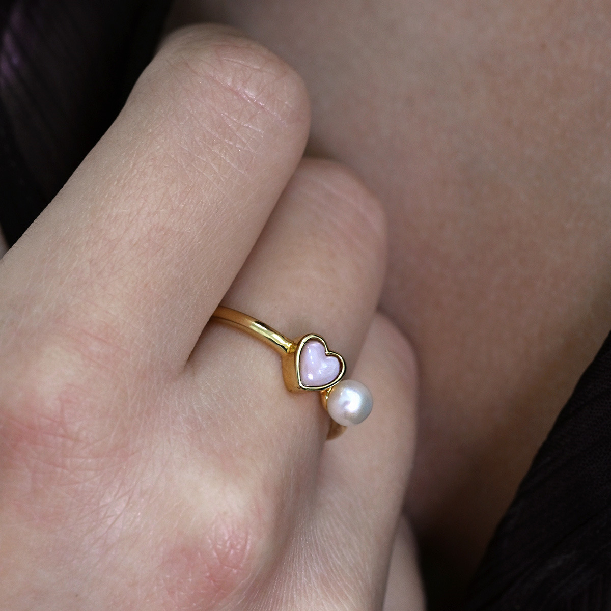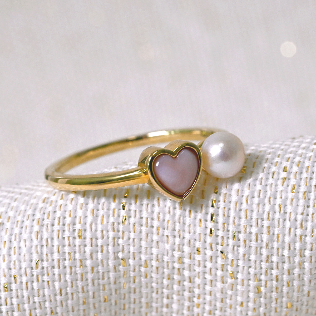 Prsten kombinuje pravou říční perlu a perleťové srdce, což vytváří jedinečný a elegantní vzhled.
