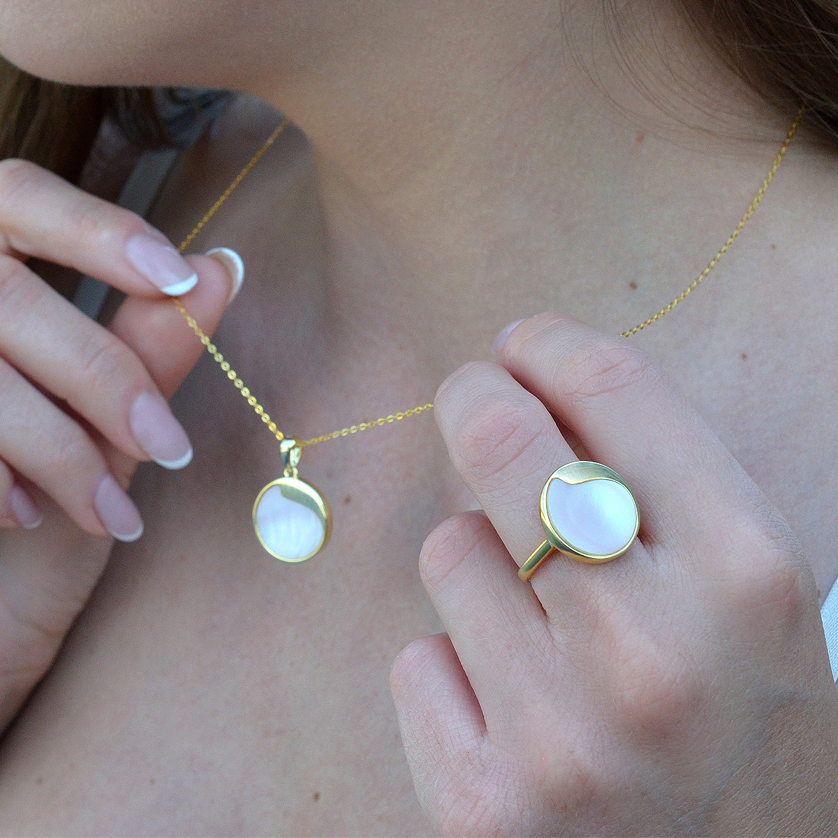 Prsten je vyroben z pozlaceného stříbra té nejvyšší kvality 925/1000. Pozlacený povrch dodává teplý, jemný lesk. Kolečko zdobené pravou růžovou perletí je decentně vykrojené, dodává šperku jedinečný charakter.