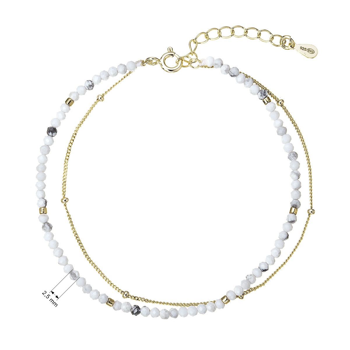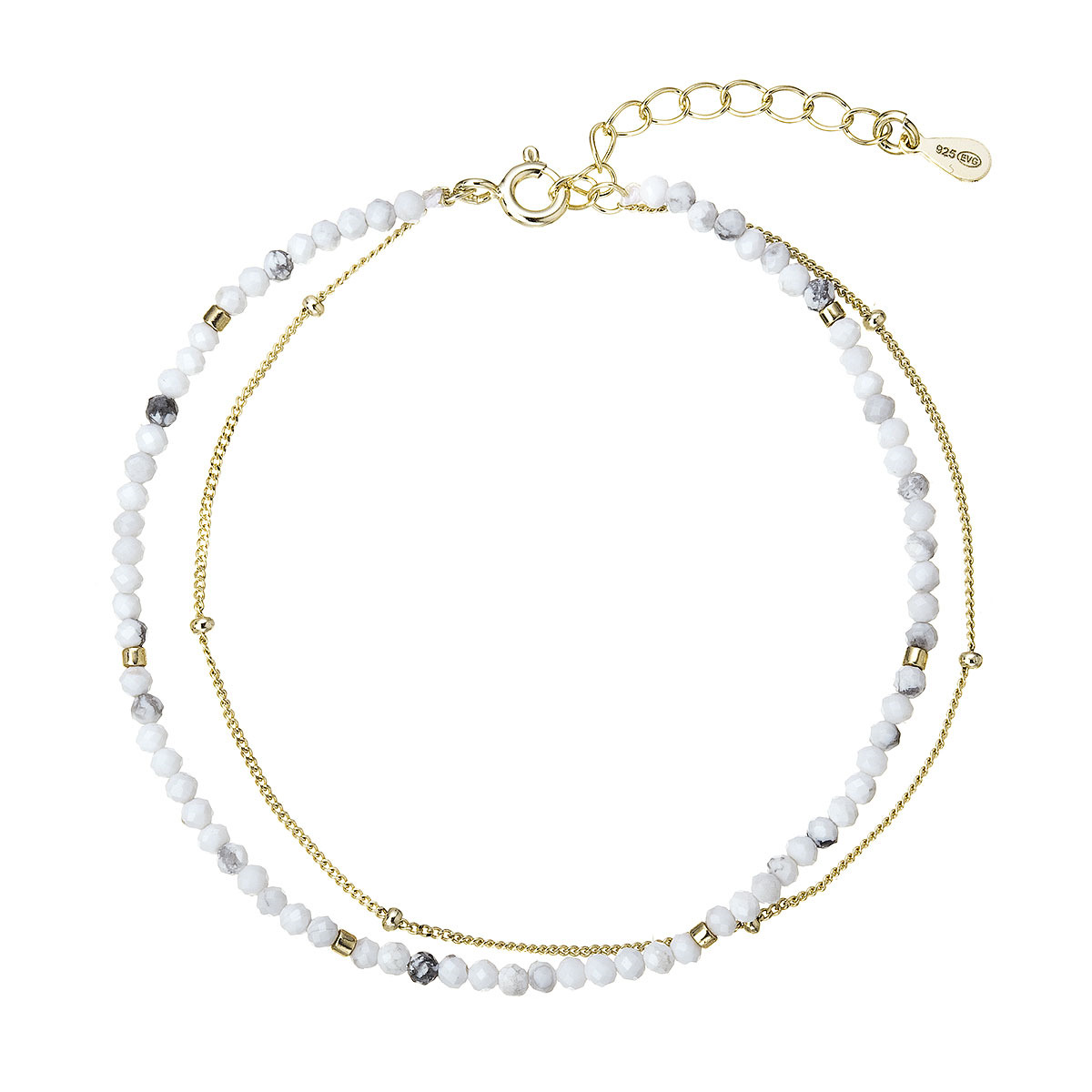 Tento hravý a elegantní dvojitý náramek spojuje jemný pozlacený stříbrný řetízek s linií drobných korálků z pravých přírodních bílých howlitů. Jejich jemná šedá kresba na bílém podkladu působí čistě, harmonicky a vytváří nadčasový, lehce minimalistický dojem, který krásně ladí s teplým zlatým odstínem kovu.