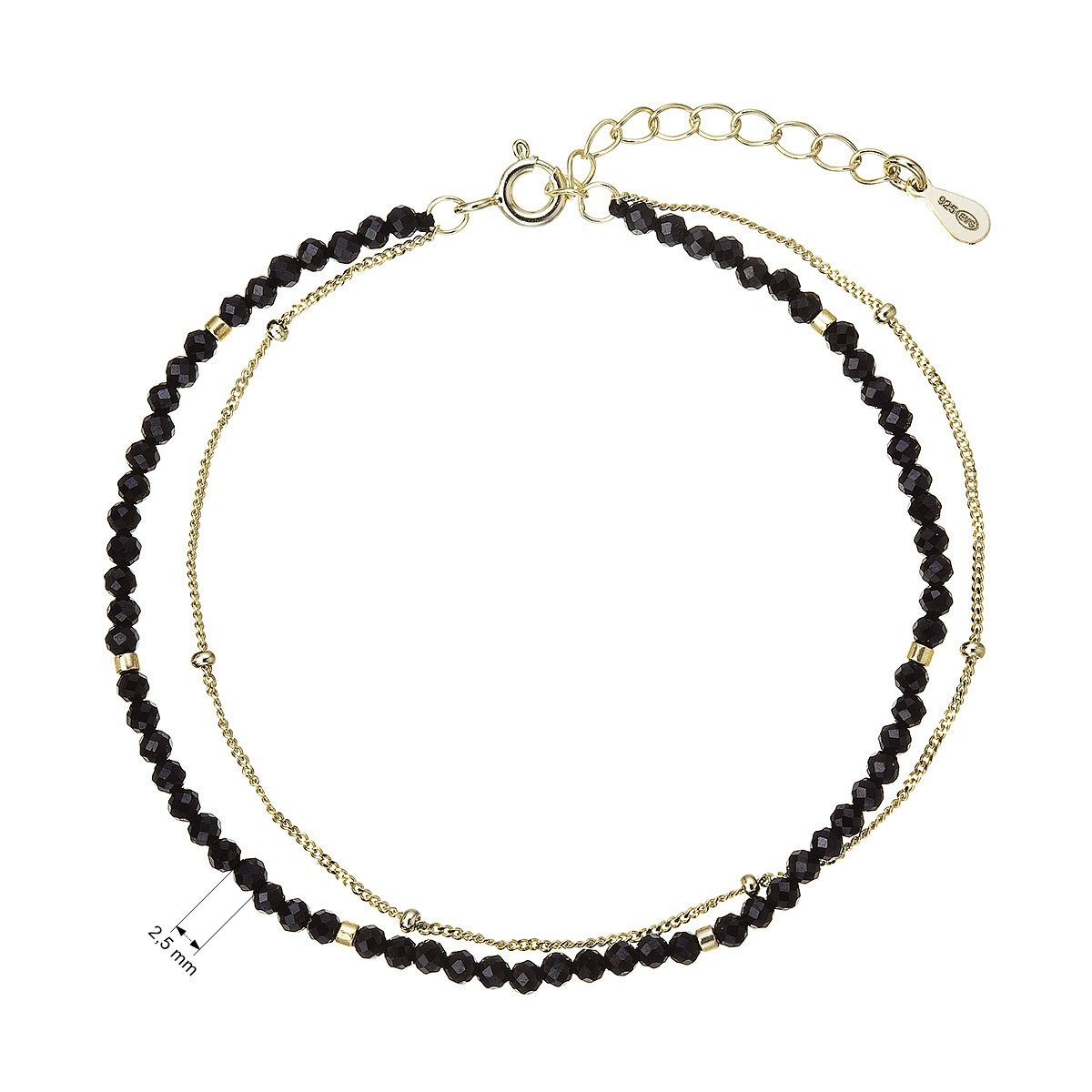 Tento působivý dvojitý náramek kombinuje jemný pozlacený stříbrný řetízek s linií drobných fasetovaných černých spinelů. Temné, výrazně se lesknoucí minerály vytvářejí nádherný kontrast k teplému zlatému odstínu kovu a dodávají šperku luxusní, moderní a výrazný charakter.