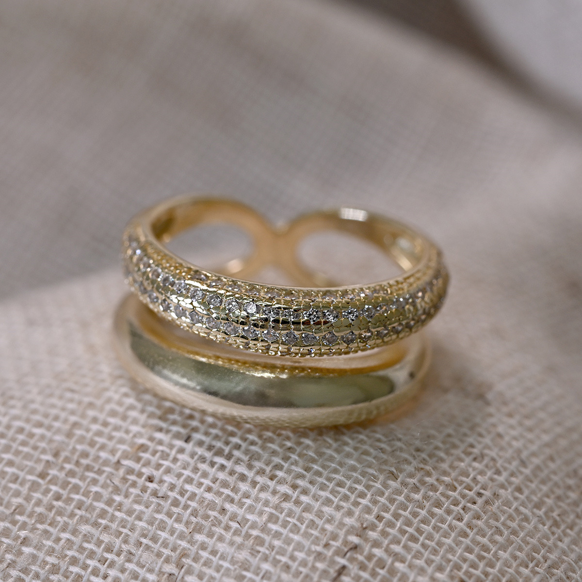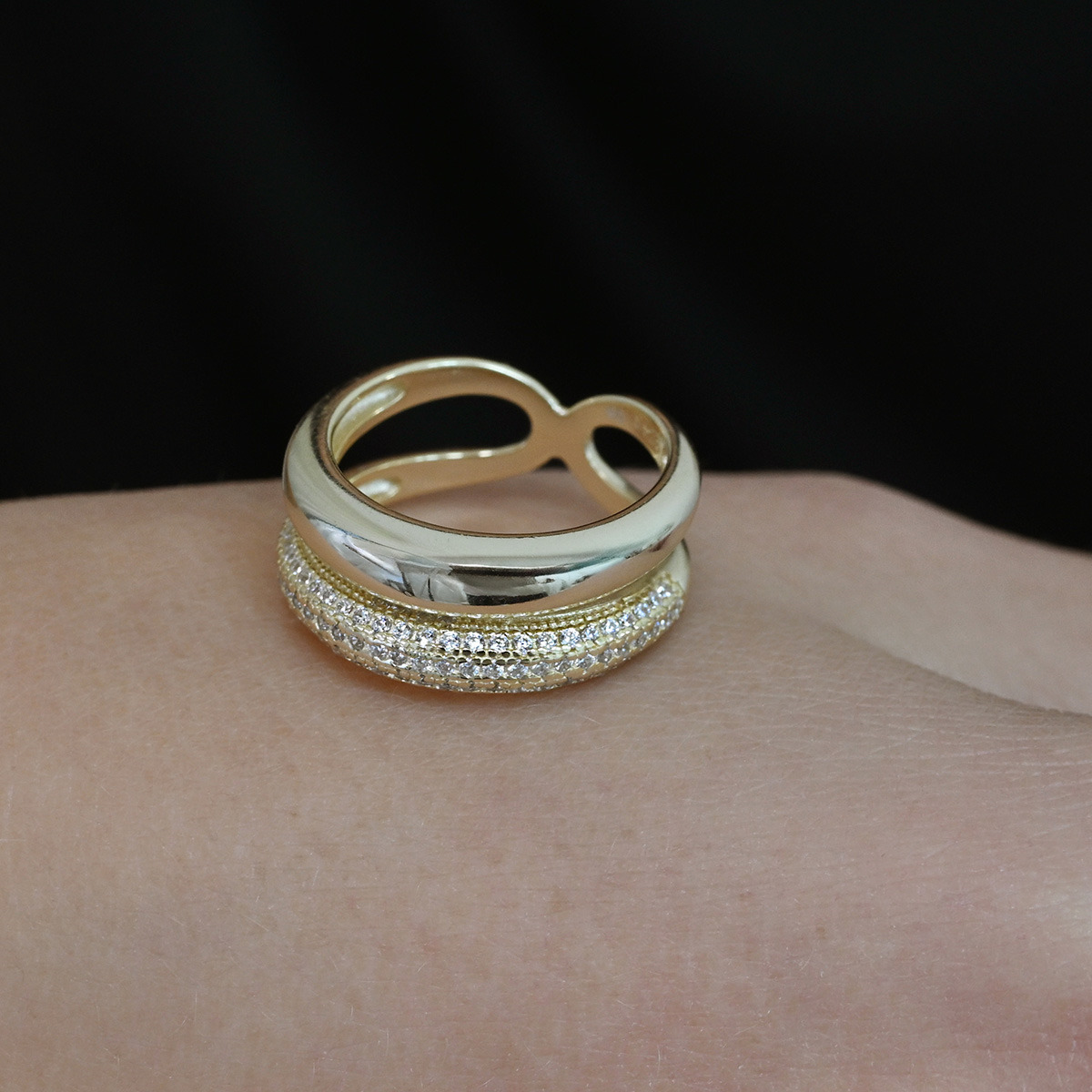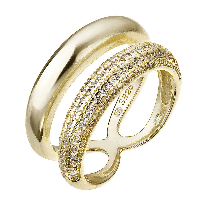 Pozlacený stříbrný prsten se zirkony je výrazným šperkem, který zaujme na první pohled. Jeho dvojitý design kombinuje hladký kroužek s kroužkem zdobeným třpytivými zirkony.