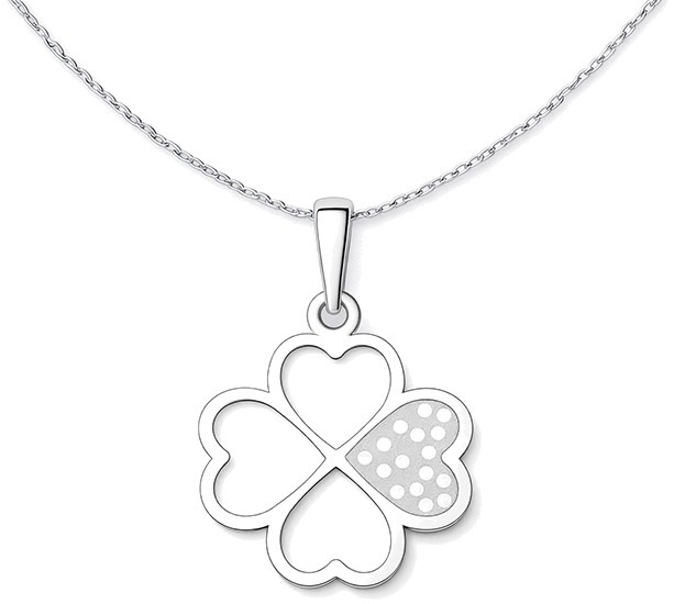 Stříbrný přívěsek ve tvaru čtyřlístku je tvořený čtyřmi srdíčky, která společně vytvářejí harmonický celek plný pozitivní energie. Minimalistické linie doplňuje decentní tečkovaná struktura na jednom lístku, která šperku dodává jemný detail a moderní nádech.
