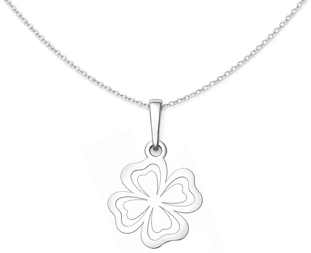 Jemný stříbrný přívěsek ve tvaru čtyřlístku zaujme elegantním a minimalistickým designem tvořeným jemnými liniemi ve tvaru srdíček. Lehká a vzdušná konstrukce dodává šperku něžný vzhled, díky kterému působí velmi decentně a stylově.