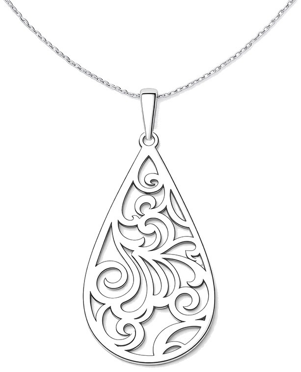 Elegantní stříbrný přívěsek ve tvaru kapky zdobí propracovaný ornamentální vzor, který působí lehce a nadčasově. Symbol kapky může představovat čistotu, harmonii i plynutí života, zatímco jemné linie dodávají šperku osobitý a ženský charakter.