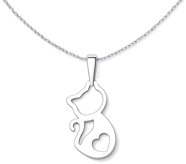 Stříbrný přívěsek ve tvaru elegantní kočky zaujme čistými liniemi a minimalistickým designem. Siluetu doplňuje malé srdce, které dodává šperku osobní význam a jemný romantický nádech.