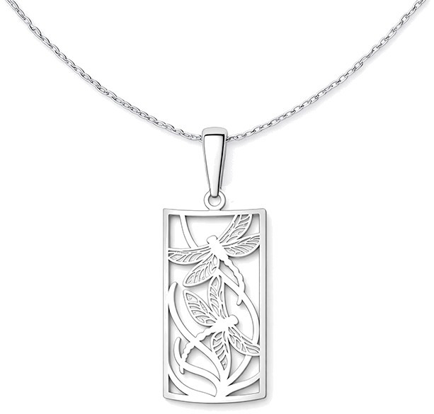 Jemný stříbrný přívěsek s motivem vážek zachycuje krásu pohybu, světla a přirozené elegance. Propracované linie v obdélníkovém rámu působí vzdušně a harmonicky, a přesto velmi výrazně.