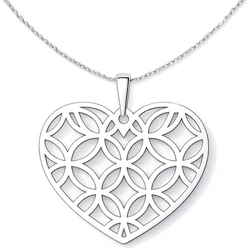 Jemný stříbrný přívěsek ve tvaru srdce zdobený elegantním geometrickým motivem symbolizuje jednotu, rovnováhu a propojení všeho kolem nás. Precizně vyřezávaný vzor dodává šperku lehkost.