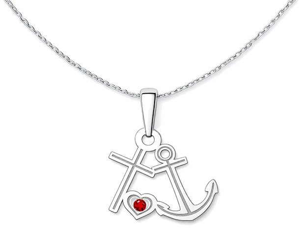 Jemný stříbrný přívěsek spojuje tři silné symboly – kříž pro víru, kotvu pro naději a srdce s červeným kamínkem jako znak lásky. Společně vytvářejí harmonický celek, který připomíná to nejdůležitější v životě.