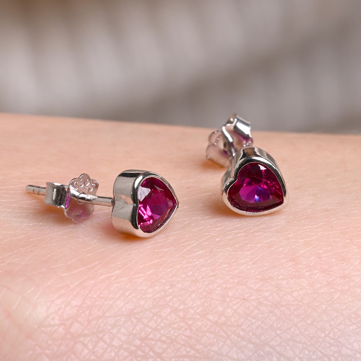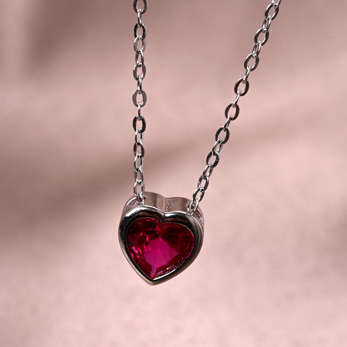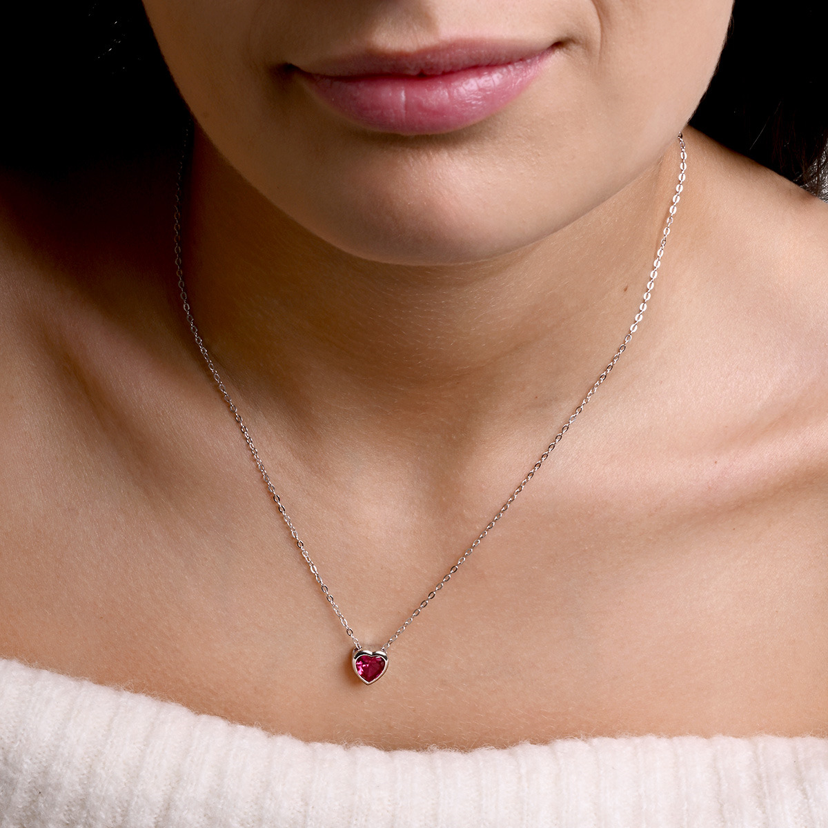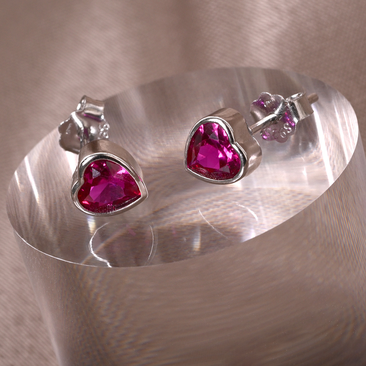 Sada stříbrných šperků, dekorovaných tmavě růžovými zirkony ve tvaru srdce