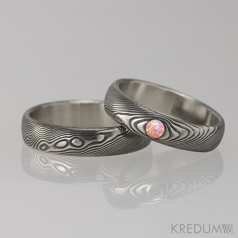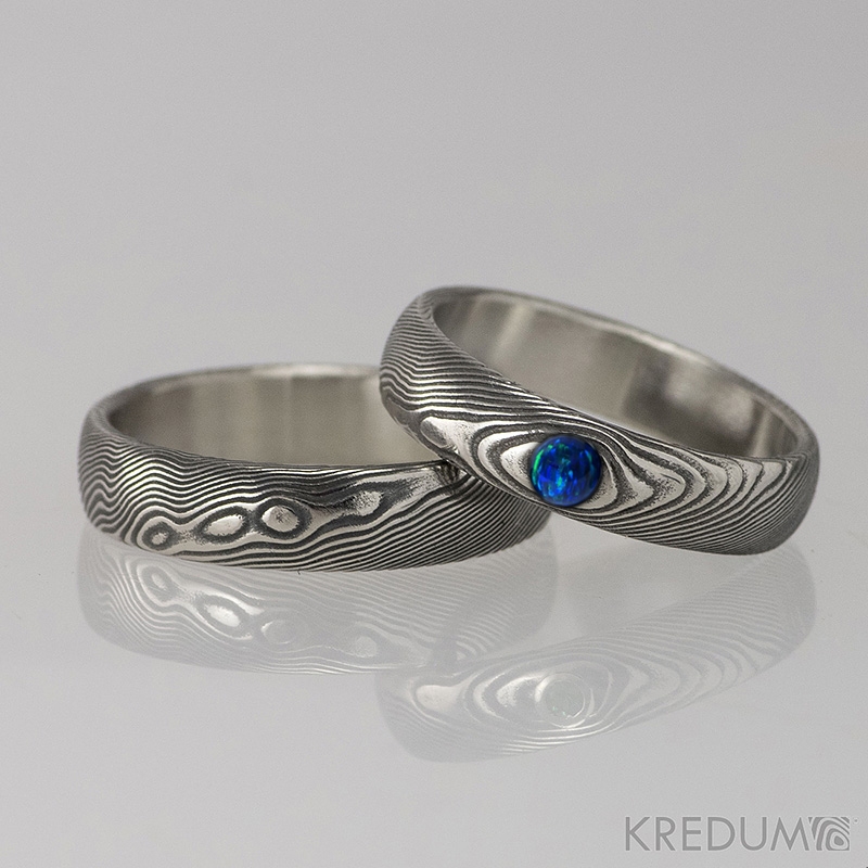 Snubní prsten kovaná nerezová ocel damasteel - PRIMA osazený syntetickým opálem