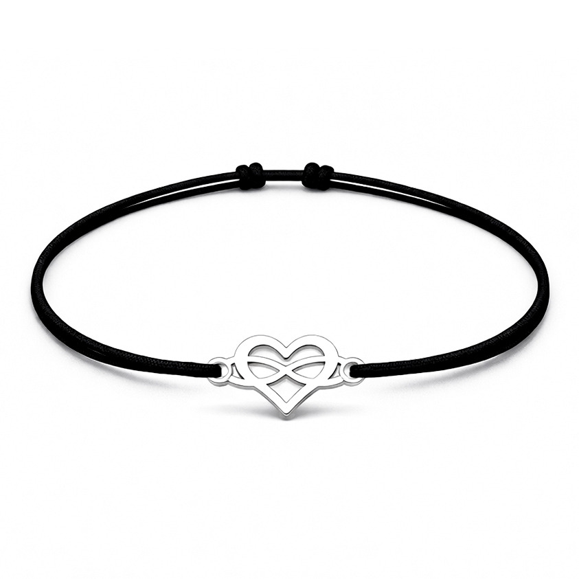 Jemný náramek se stříbrným motivem srdce propojeného se symbolem nekonečna vyjadřuje věčnou lásku, spojení a nekonečné pouto. Nastavitelná délka umožňuje snadné přizpůsobení zápěstí.