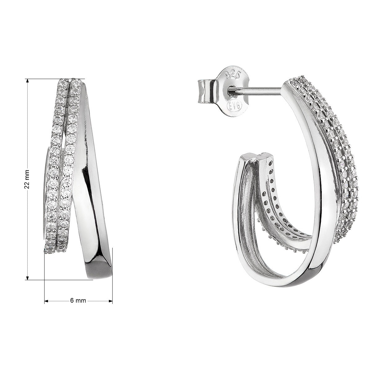 Náušnice jsou vyrobeny ze stříbra ryzosti 925/1000 s povrchovou úpravou rhodiem. Díky rhodiu je šperk nádherně lesklý a zároveň je chráněn proti zčernání a poškrábání. Náušnice jsou tvořeny dvěma kruhovými liniemi, z nichž jedna je hladká, druhá osázená třpytivými zirkony.
