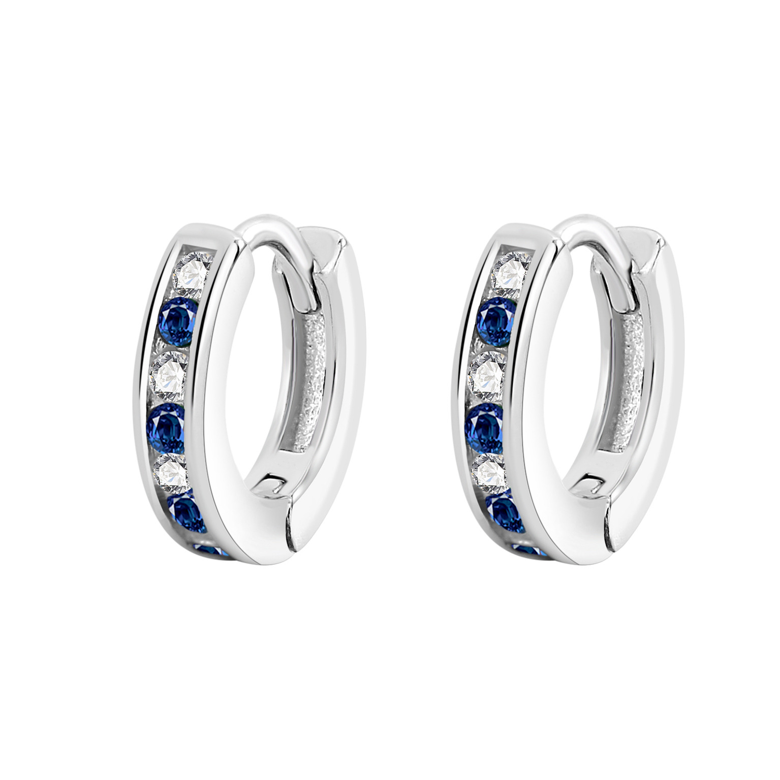Dámské náušnice kroužky dekorované kubickými zirkony modré a čiré barvy. Náušnice jsou vyrobeny ze stříbra s jakostním označením 925/1000 povrchově upravené rhodiováním