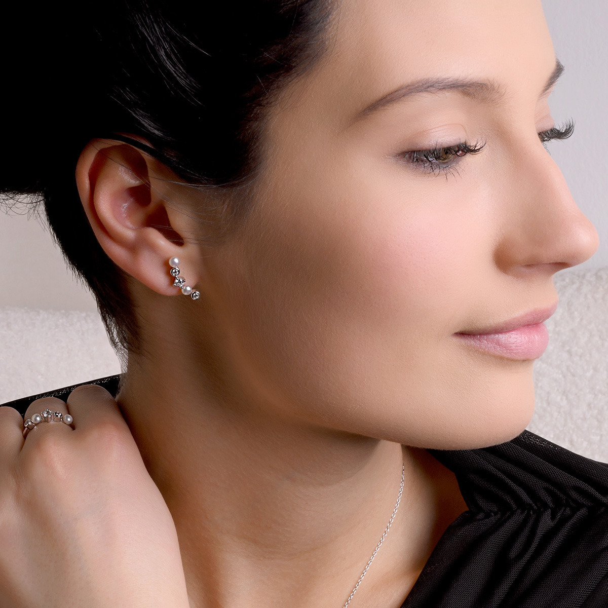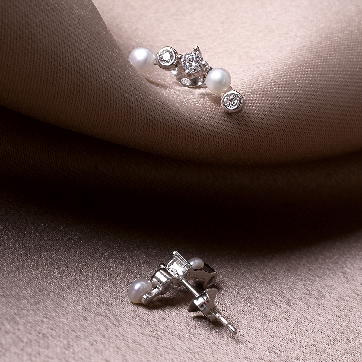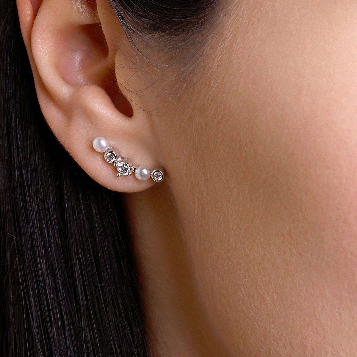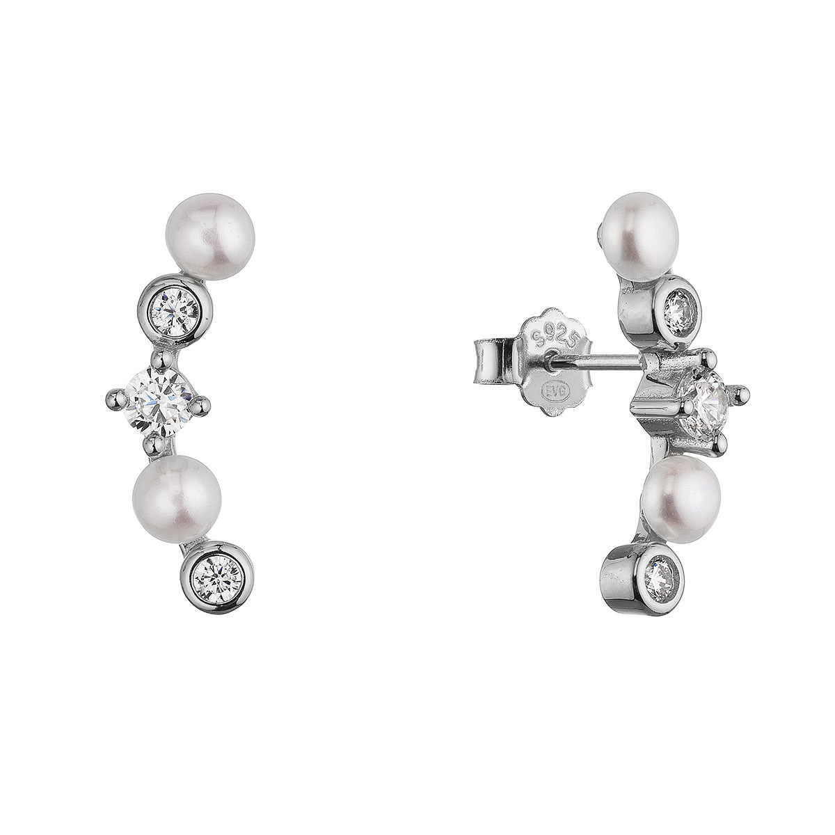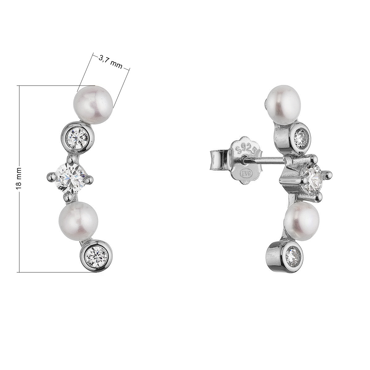 Náušnice vynikají svým vertikálním tvarem, který je tvořen drobnou linií prvků. Uprostřed je dominantní čirý zirkon, který dodává šperku na eleganci. Říční perly v přírodním bílém odstínu se střídají s menšími zirkony, což vytváří harmonický a vyvážený vzhled. Ideální pro každodenní nošení i slavnostní příležitosti.