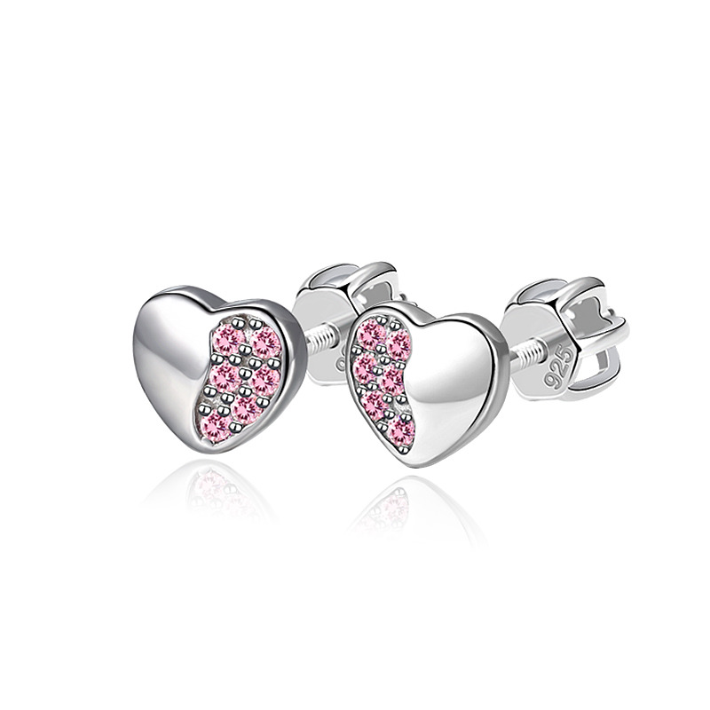 Stříbrné šroubovací náušnice srdíčka, růžové zirkony