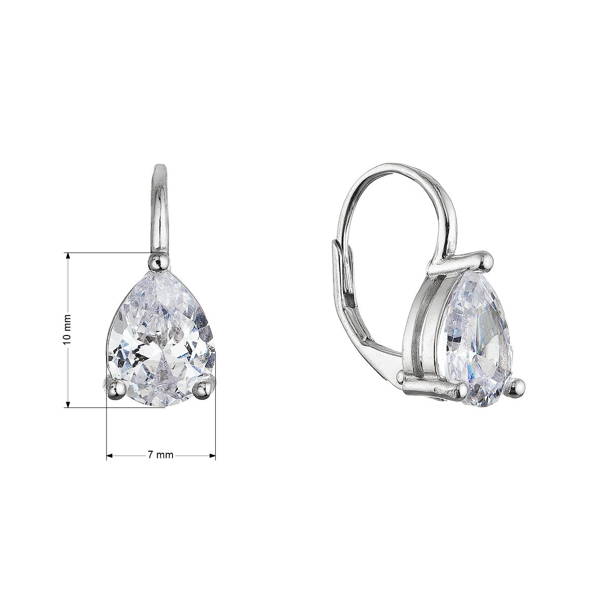 Stříbrné visací náušnice s ryzostí 925/1000 a rhodiovou úpravou zaujmou svým elegantním designem ve tvaru kapky, který působí jemně a zároveň výrazně. Dominantou každé náušnice je čirý zirkon v broušení kapky, který je precizně zasazen do středu a září čistým leskem. Zajímavým detailem jsou tři kovové výstupky umístěné za kamenem, které nejenže dodávají šperku jedinečnou plasticitu, ale zároveň zajišťují optické zvýraznění samotného zirkonu.
