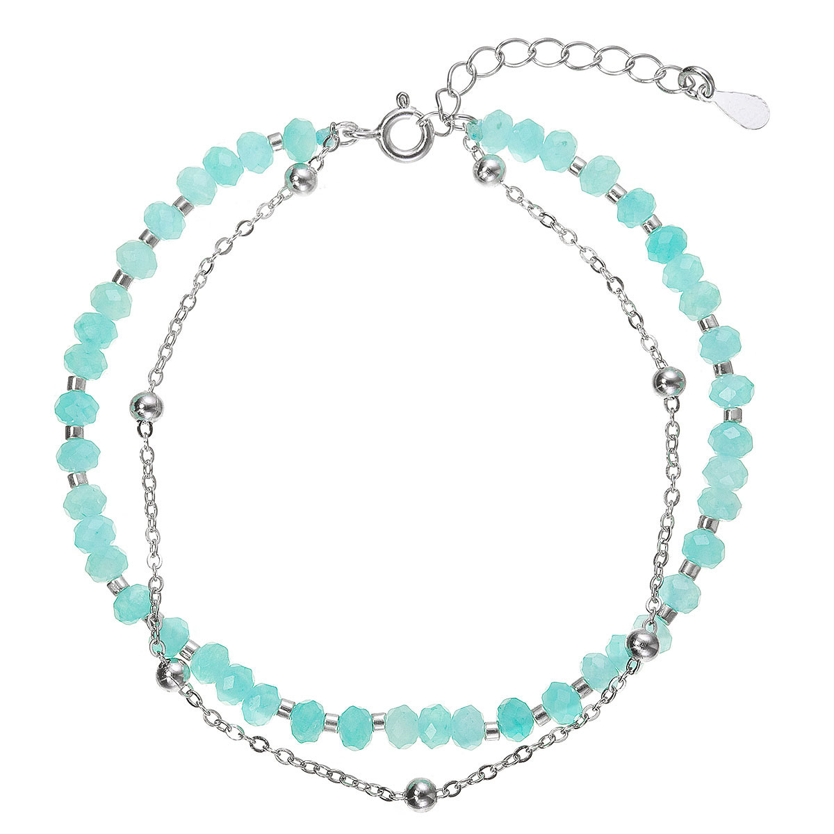 Tento jemný dvojitý náramek spojuje elegantní rhodiovaný stříbrný řetízek s linií korálků z pravých amazonitů v krásných světle tyrkysových tónech. Amazonit je ceněný pro svůj uklidňující vzhled a jemnou pastelovou barvu, která dodá šperku svěží a lehce letní nádech. Rhodiovaná úprava stříbra 925/1000 zajišťuje vysoký lesk a lepší odolnost vůči opotřebení. Díky karabince a prodlužovacímu řetízku lze náramek upravit z 17 cm o další 4 cm