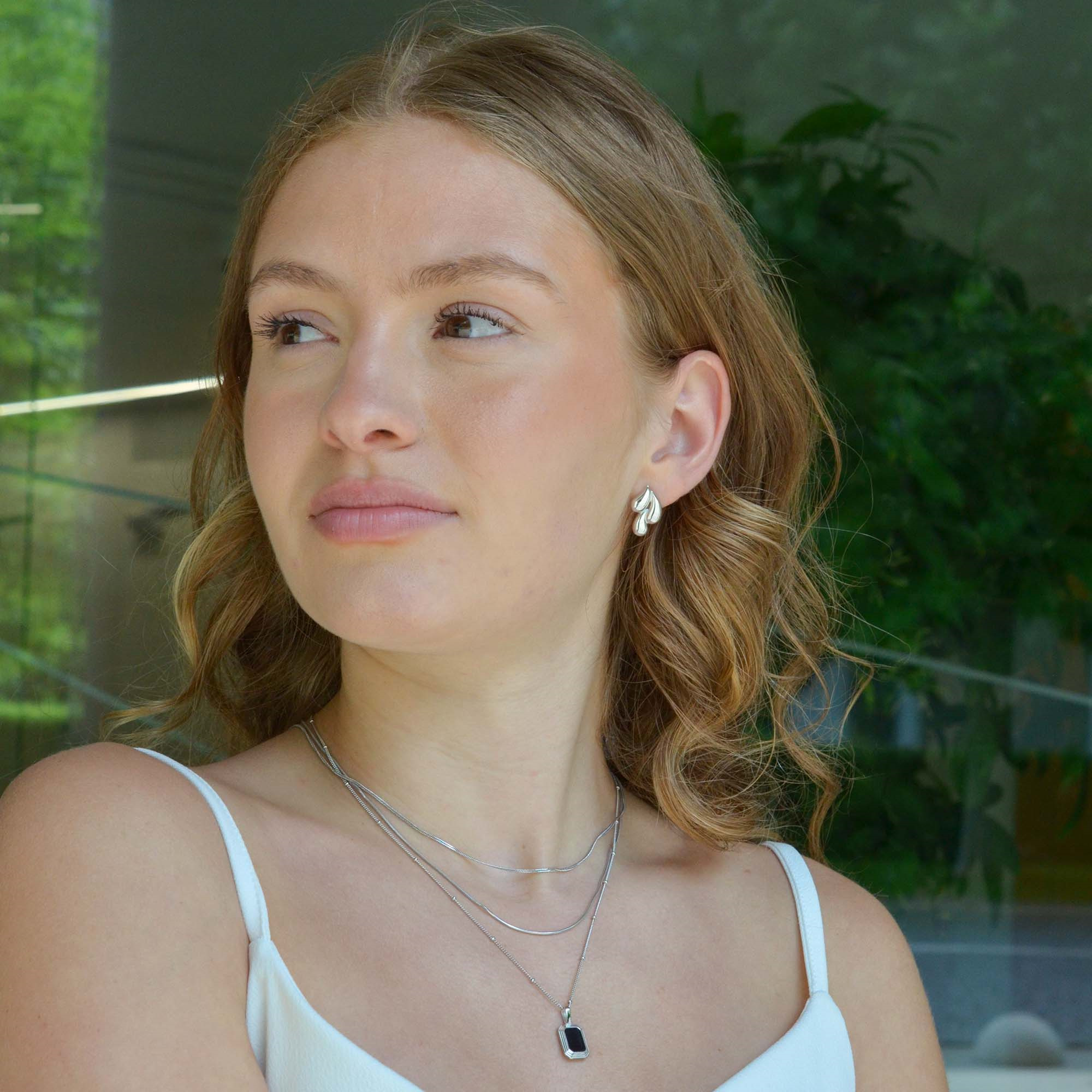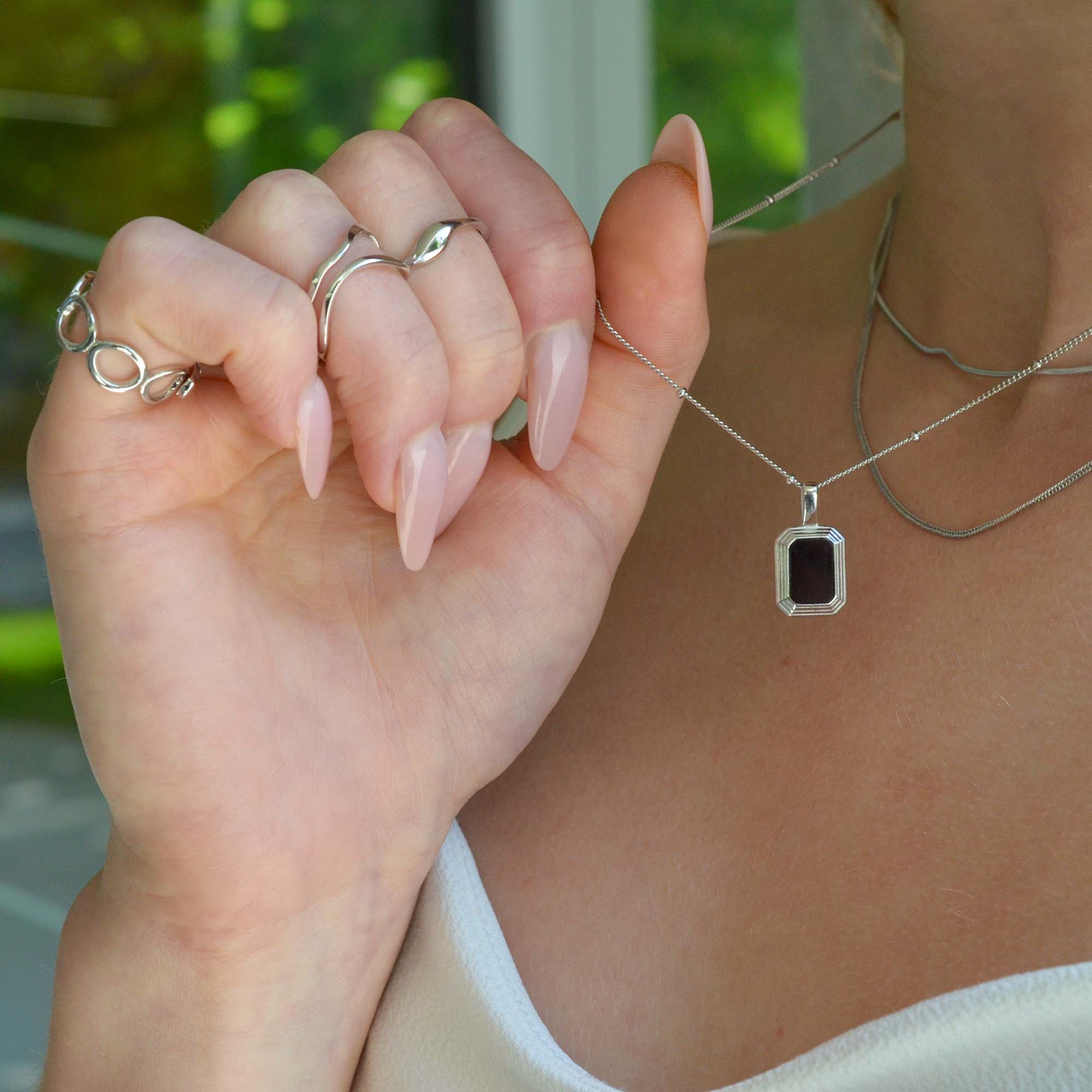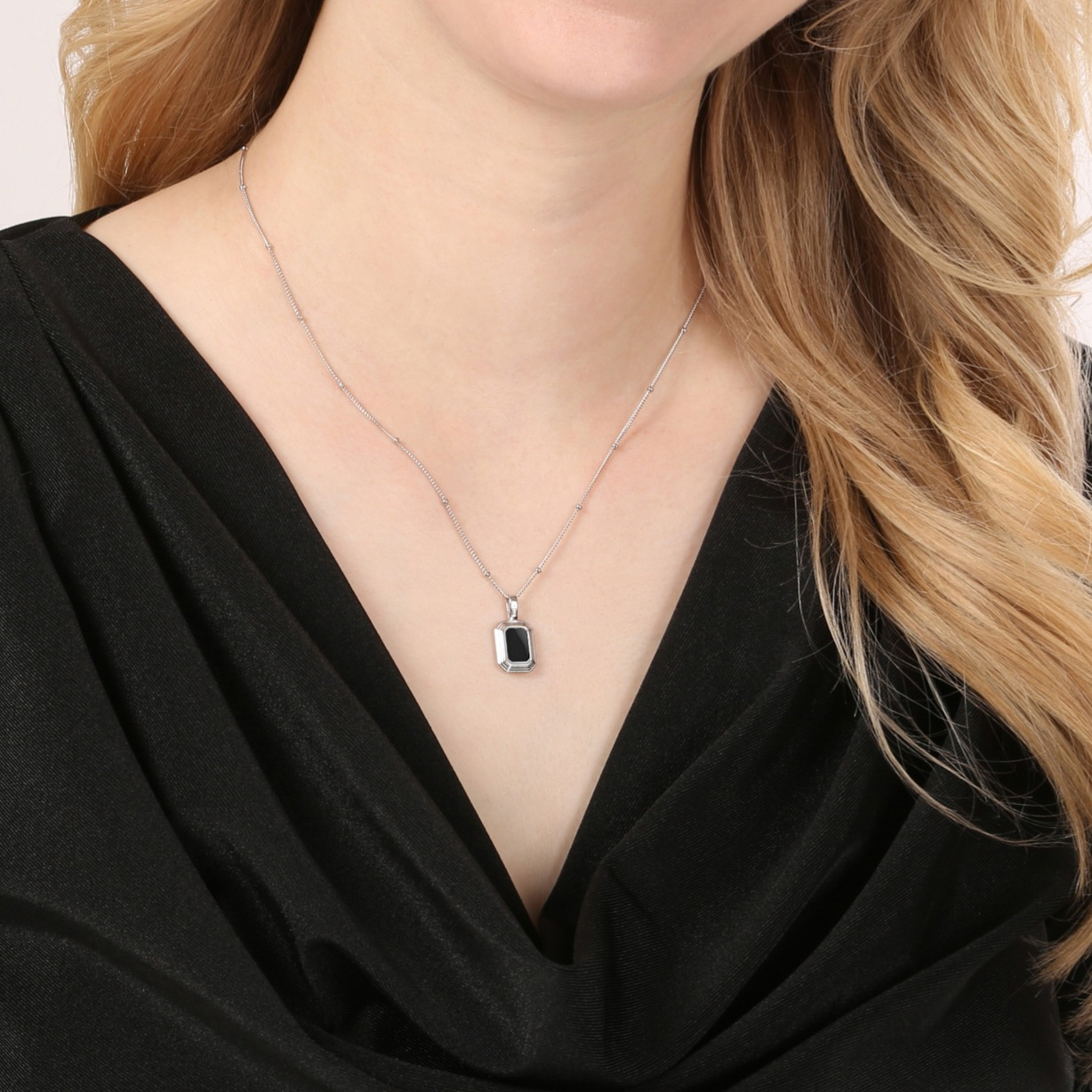 Stříbrný náhrdelník s perletí a černým achátem nabízí jedinečný oboustranný design, který vám umožní měnit vzhled šperku podle nálady či příležitosti. Na jedné straně se nachází nádherná syntetická bílá perleť, která dodává šperku jemný lesk a sofistikovanost, zatímco druhá strana ukrývá fascinující syntetický černý achát, jenž přináší tajemnou a elegantní eleganci.