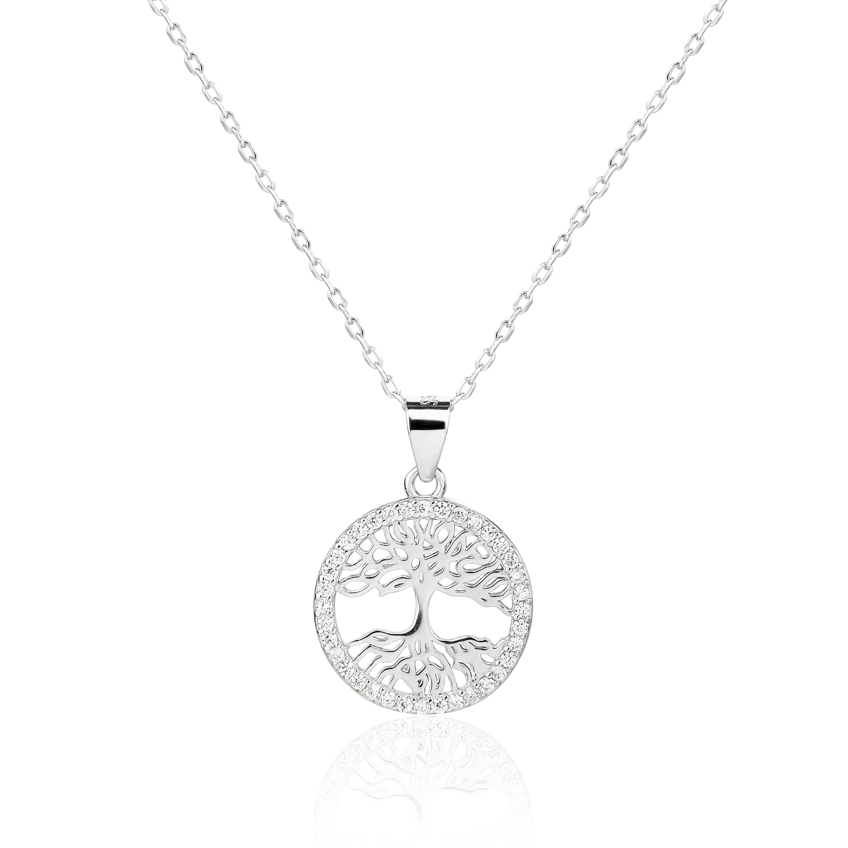 Stříbrný náhrdelník s přívěškem s motivem strom života. Přívěšek je dekorovaný barevnými zirkony - zelenými, modrými, fialovými a čirými