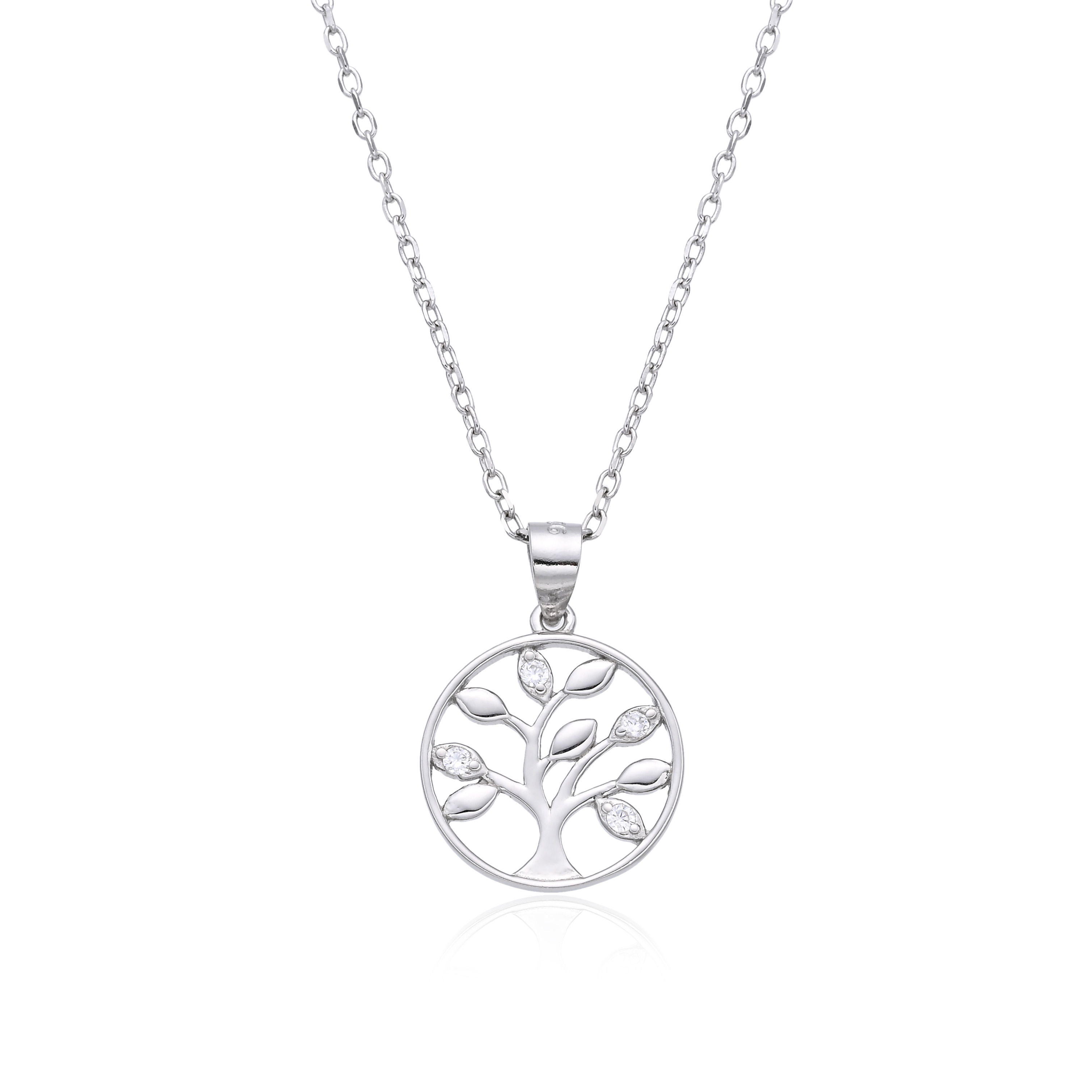 Stříbrný náhrdelník s přívěskem s motivem strom života. Přívěšek je dekorovaný čirými zirkony