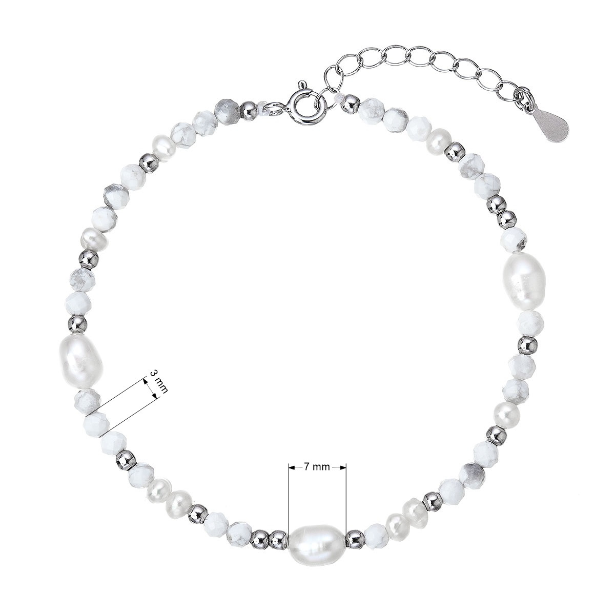 Tento elegantní náramek je tvořen kombinací pravých howlitů bílé barvy a pravých říčních perel různých tvarů, které dohromady vytvářejí harmonický a ženský celek. Drobné broušené howlity se krásně lesknou a dokonale ladí s přirozeným perleťovým třpytem perel.
