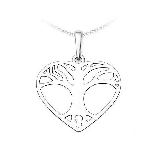 Jemný stříbrný přívěsek ve tvaru srdce zdobí stylizovaný motiv stromu, jehož větve se přirozeně rozprostírají po celé ploše šperku. Prořezávaný design dodává přívěsku lehkost, eleganci a moderní vzhled, díky kterému krásně vynikne při každodenním nošení.