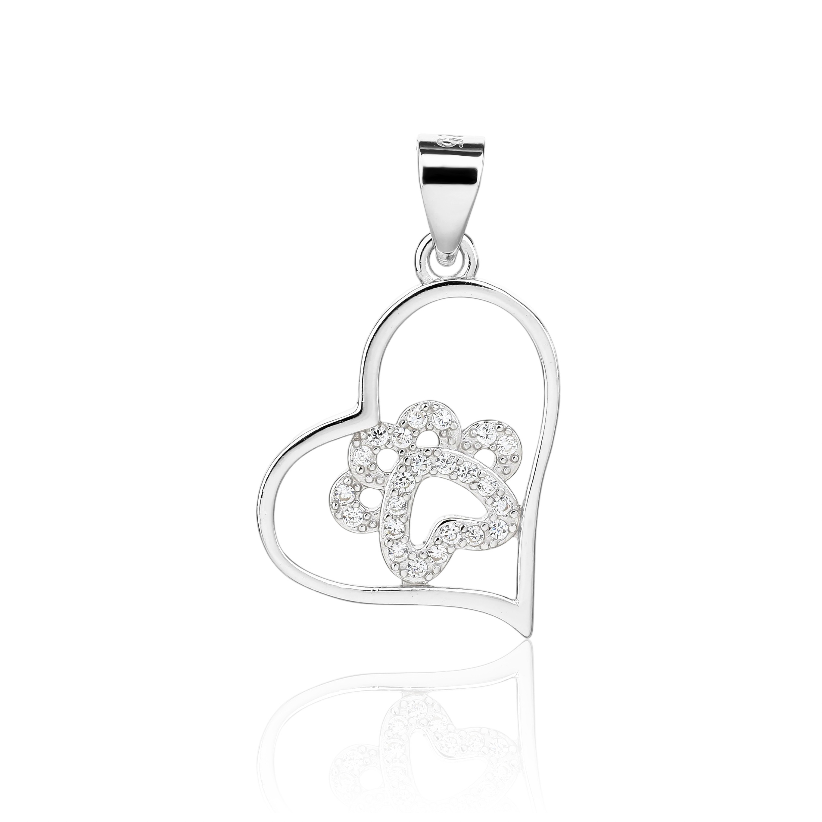 Stříbrný přívěsek ve tvaru srdíčka zdobeného sybolem psí tlapky
