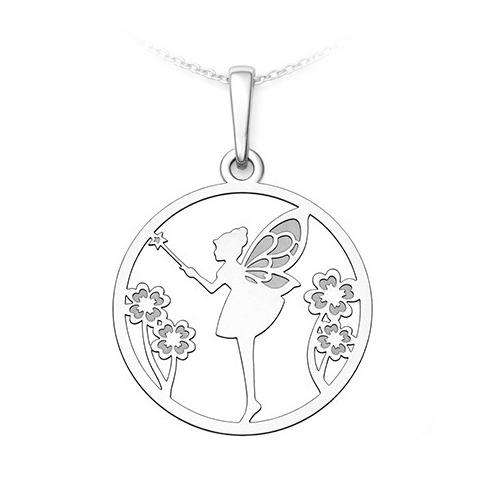 Jemný stříbrný přívěsek s motivem víly zaujme romantickým a hravým designem. Silueta víly s křídly je zasazena do kulatého rámu a doplněna jemnými květinovými motivy, které šperku dodávají pohádkovou atmosféru a lehkost.