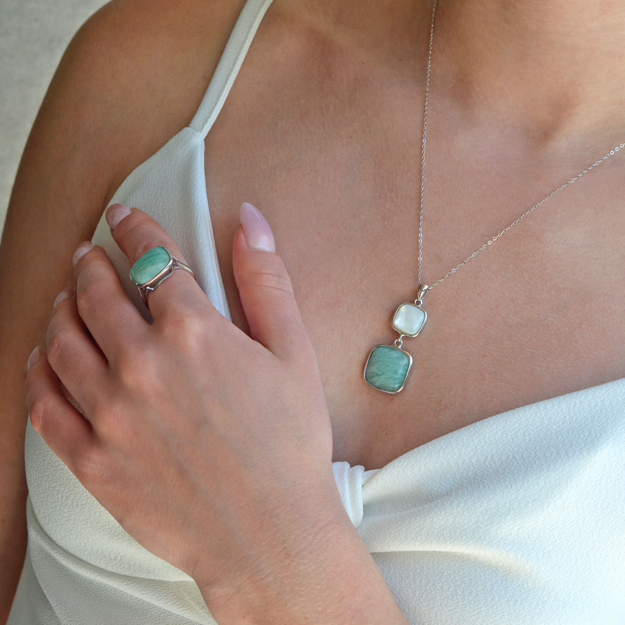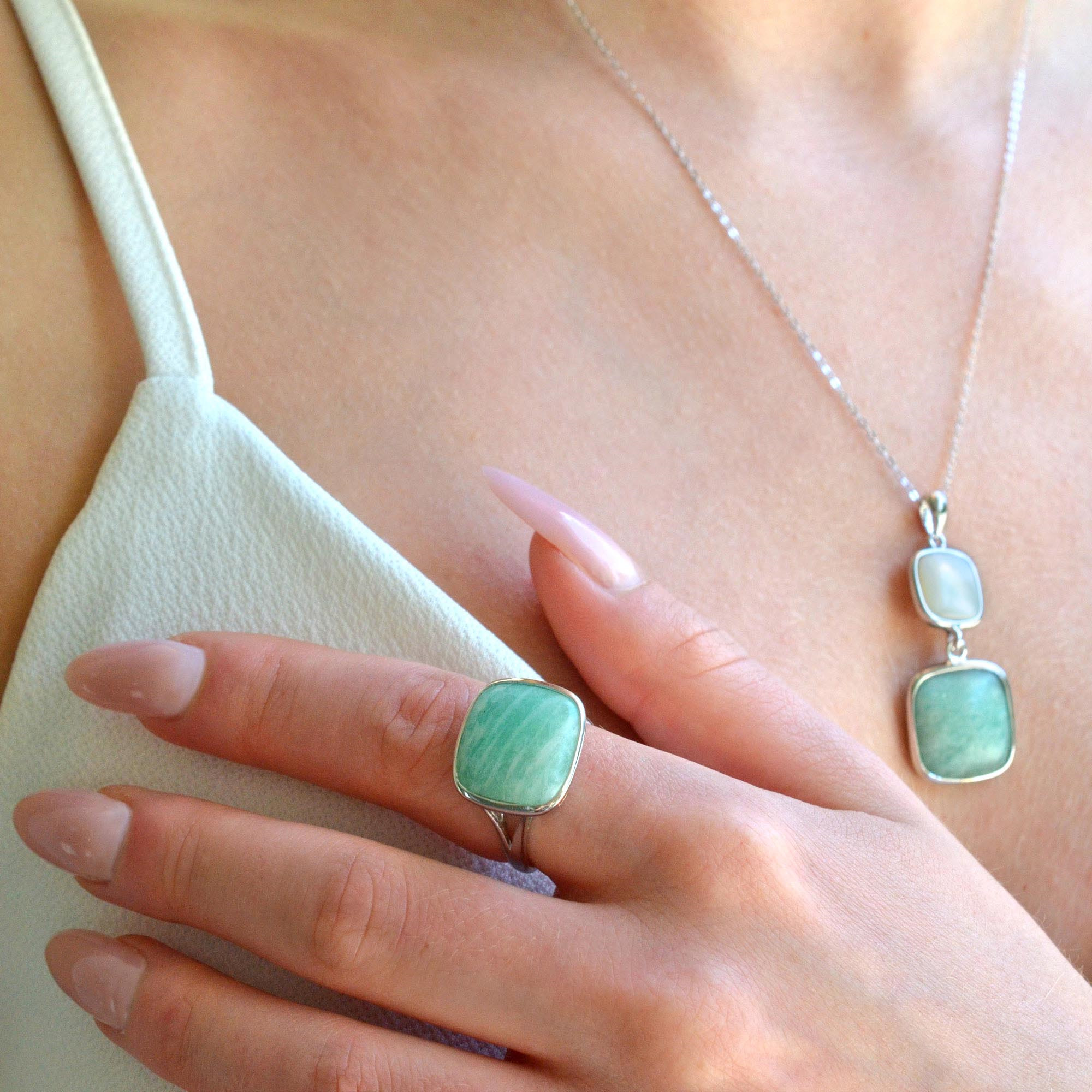 Prsten je vyroben ze stříbra té nejvyšší kvality a jejich povrch je dokonale chráněn rhodiovou úpravou. Rhodium dodává šperku nepřekonatelný lesk a ochranu proti oxidaci. Výrazný čtvercový kámen amazonit v zelenkavých tónech, ohraničený stříbrem vytváří luxusní dojem. Ukrývá energii klidu a vnitřní síly.