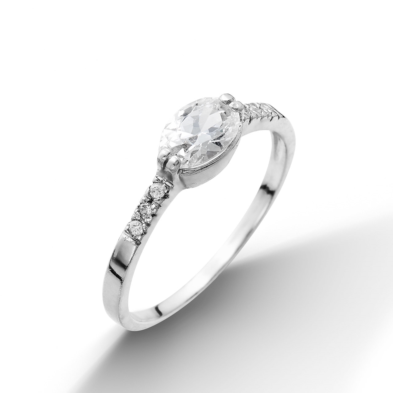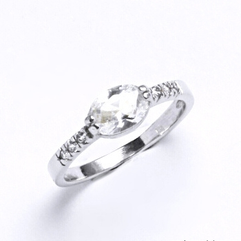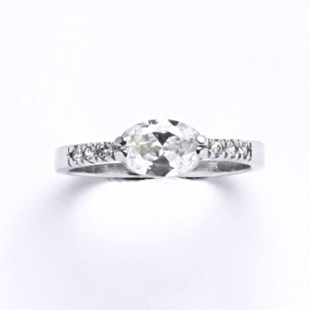Stříbrný prsten zdobený větším oválným zirkonem a menšími kulatými zirkony čiré barvy