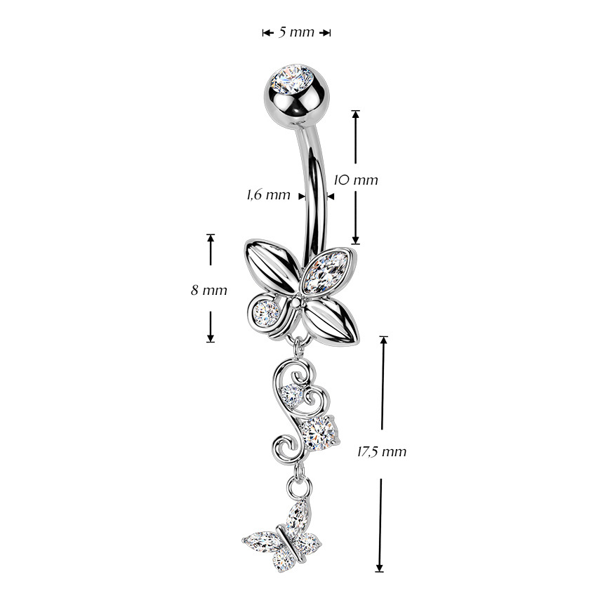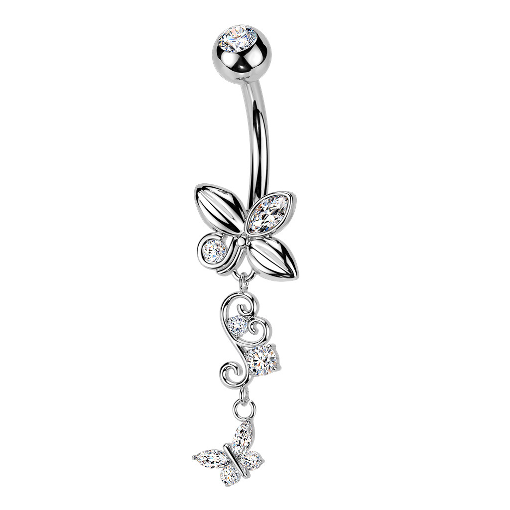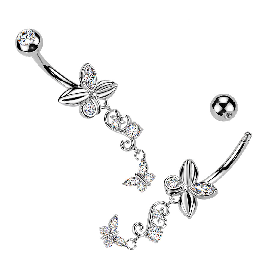 Piercing do pupíku s dekorativní visací částí ve tvaru motýlka zdobeného zirkony