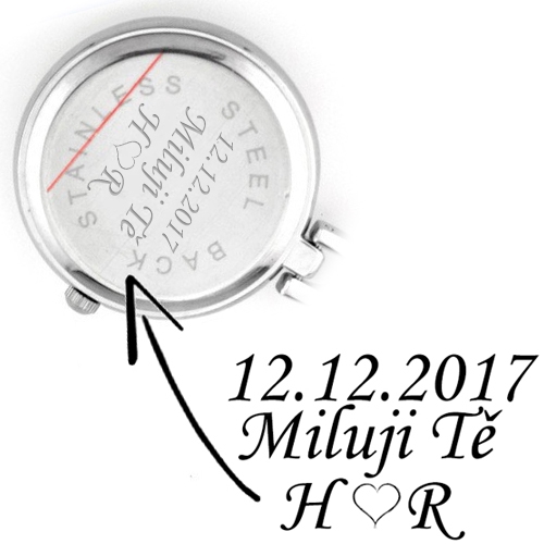 Na zakázku lze zadní stranu hodinek opatřit krátkou rytinou rozloženou maximálně do 3 řádků