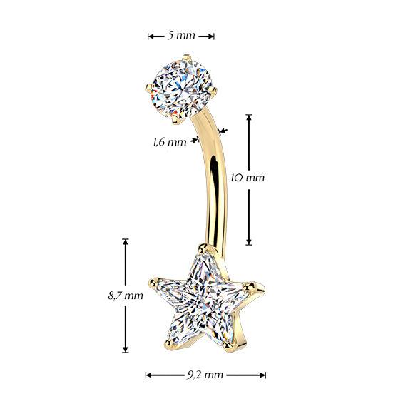 Zlacený ocelový piercing do pupíku hvězda