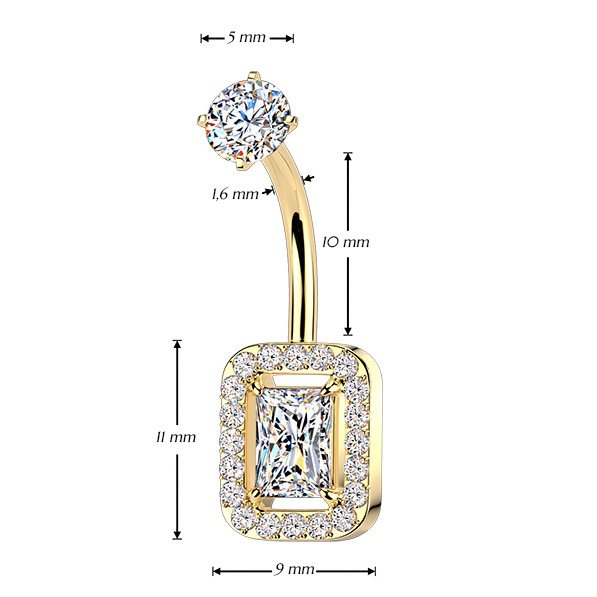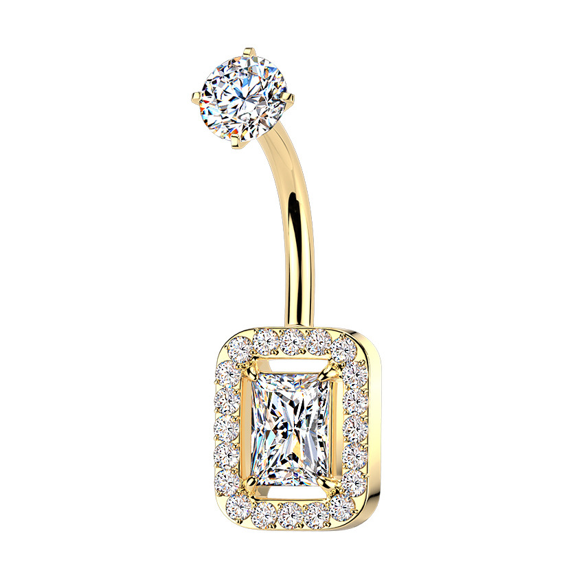 Piercing do pupíku s ozdobnou částí ve tvaru obdélníku dekorovaného zirkony