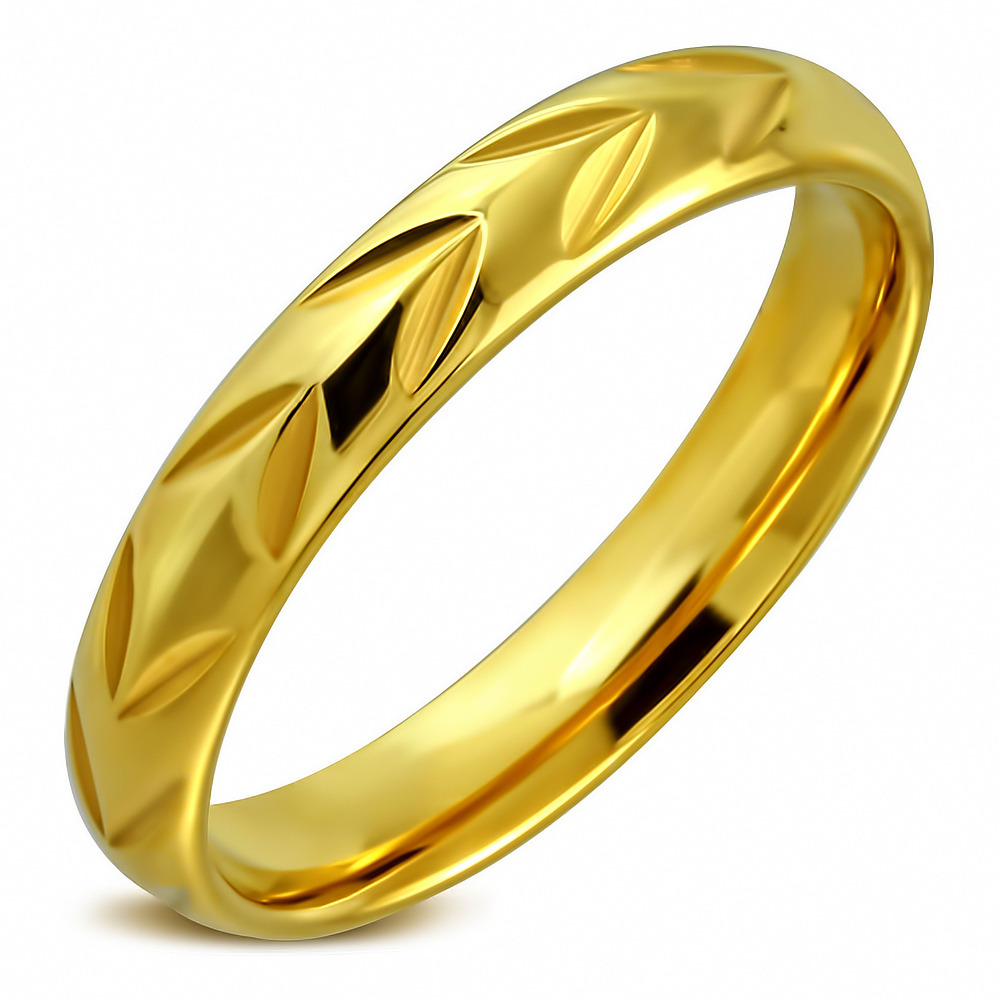 Zlacený ocelový snubní prsten s lesklým povrchem a decentním dekorem