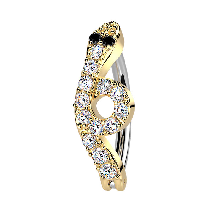 Nudí-li Vás již klasické pupíkovky, pak věříme, že Vás zaujme tento nový typ piercingu do pupíku se štítem dekorovaným motivem hada