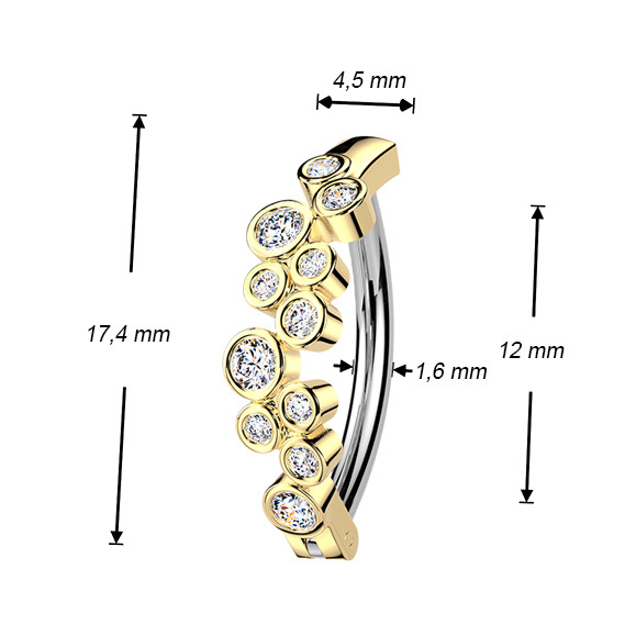 Tyčka tohoto piercingu je vyrobena z jakostní nerezové oceli a ozdobný štít je z nezávadné bižuterie se zlaceným povrchem