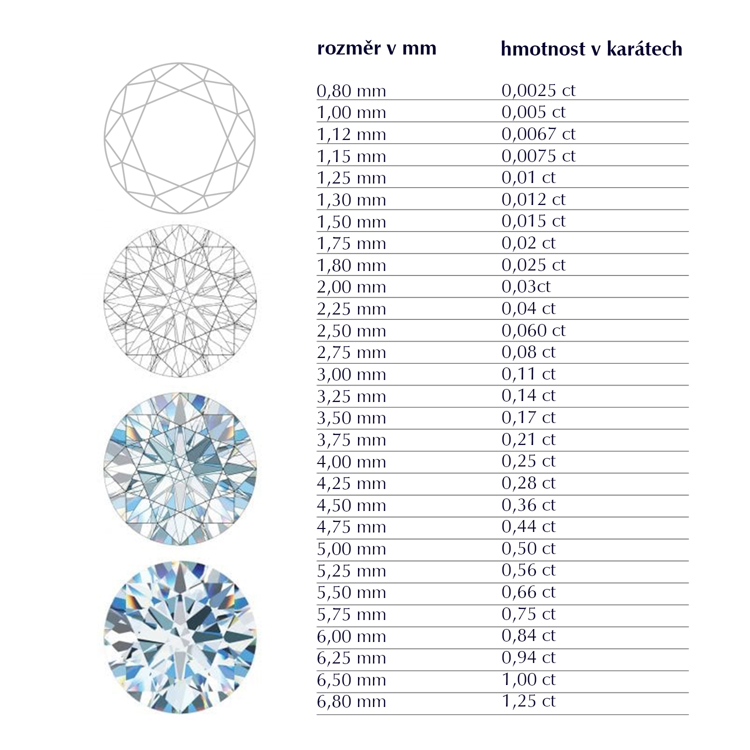 tabulka velikostí briliantu